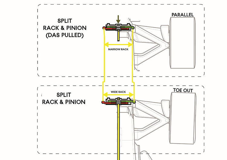 วัตถุประสงค์หลักของระบบ DAS ก็คือการทำให้นักแข่งสามารถปรับเปลี่ยนมุนล้อ ที่เรียกว่า ‘มุมโท’ (Toe Angle) ได้อย่างอิสระ โดยหลักการก็คือว่า การดึงพวงมาลัยเข้า-ออกจากตัวนักแข่ง จะทำให้ระยะและองศาของคันชัก-คันส่ง (Tie Rod หรือ Track Rod) เปลี่ยนไป เป็นผลให้มุมล้อที่เรียกว่า ‘มุมโท’ เปลี่ยนไปด้วยเช่นกันครับ ซึ่งจะส่งผลทั้งในแง่ของสมรรถนะในการควบคุมบังคับ (Handling) , ความสามารถในสร้างแรงยึดเกาะของยาง (Grip Performance) รวมไปถึงการรักษาอุณหภูมิและอัตราการสึกหรอของยางหรือที่เรียกว่า ‘Tire Management’ อีกด้วย