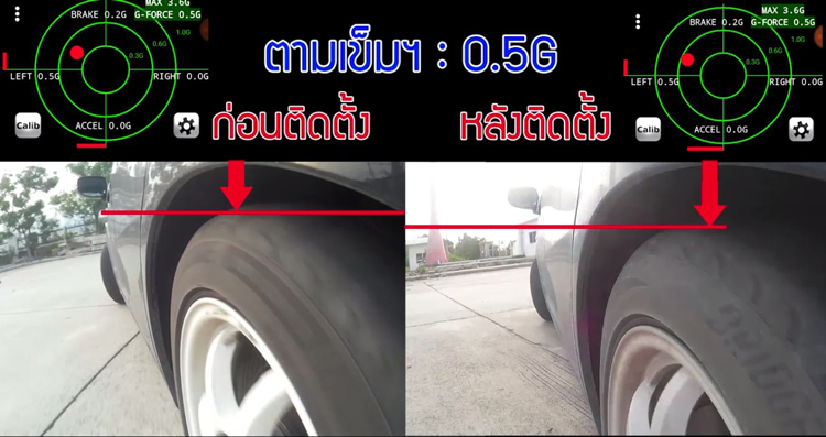 ผลการทดสอบออกมาเป็นที่น่าพอใจมากครับ สำหรับการขับที่ G = 0.3 นั้น พบว่าอาการโคลงตัวลดลงพอสมควร แต่สำหรับการขับที่ G = 0.5 อาการโคลงตัวของรถ ลดลงอย่างเห็นได้ชัด (สามารถดูผลทดสอบได้ที่วิดีโอ รีวิวและทดสอบ เหล็กกันโคลงหลัง แบบฟูล-เซ็ท)